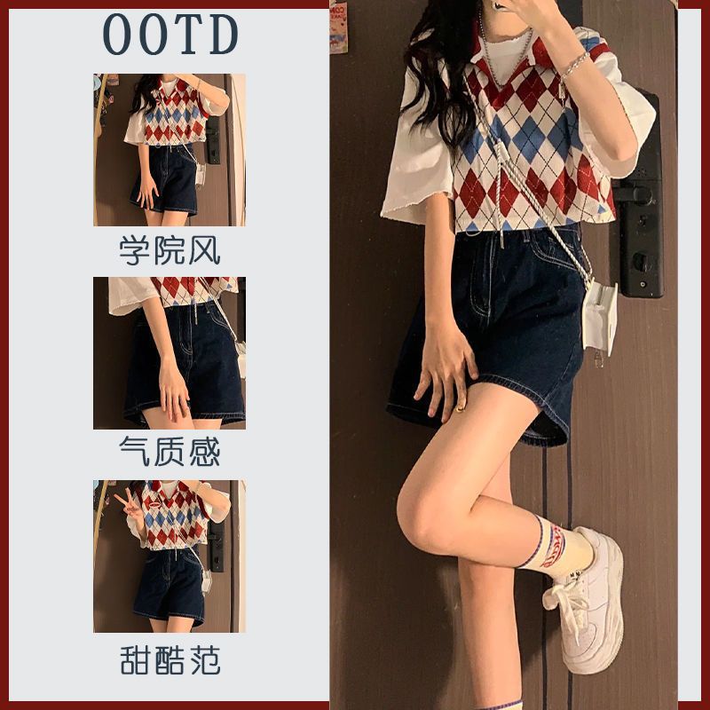Three-piece Suit/One-piece Summer New College Style Solid Color Top Sweet Cool Rhombic Knitted Vest Denim Skirt