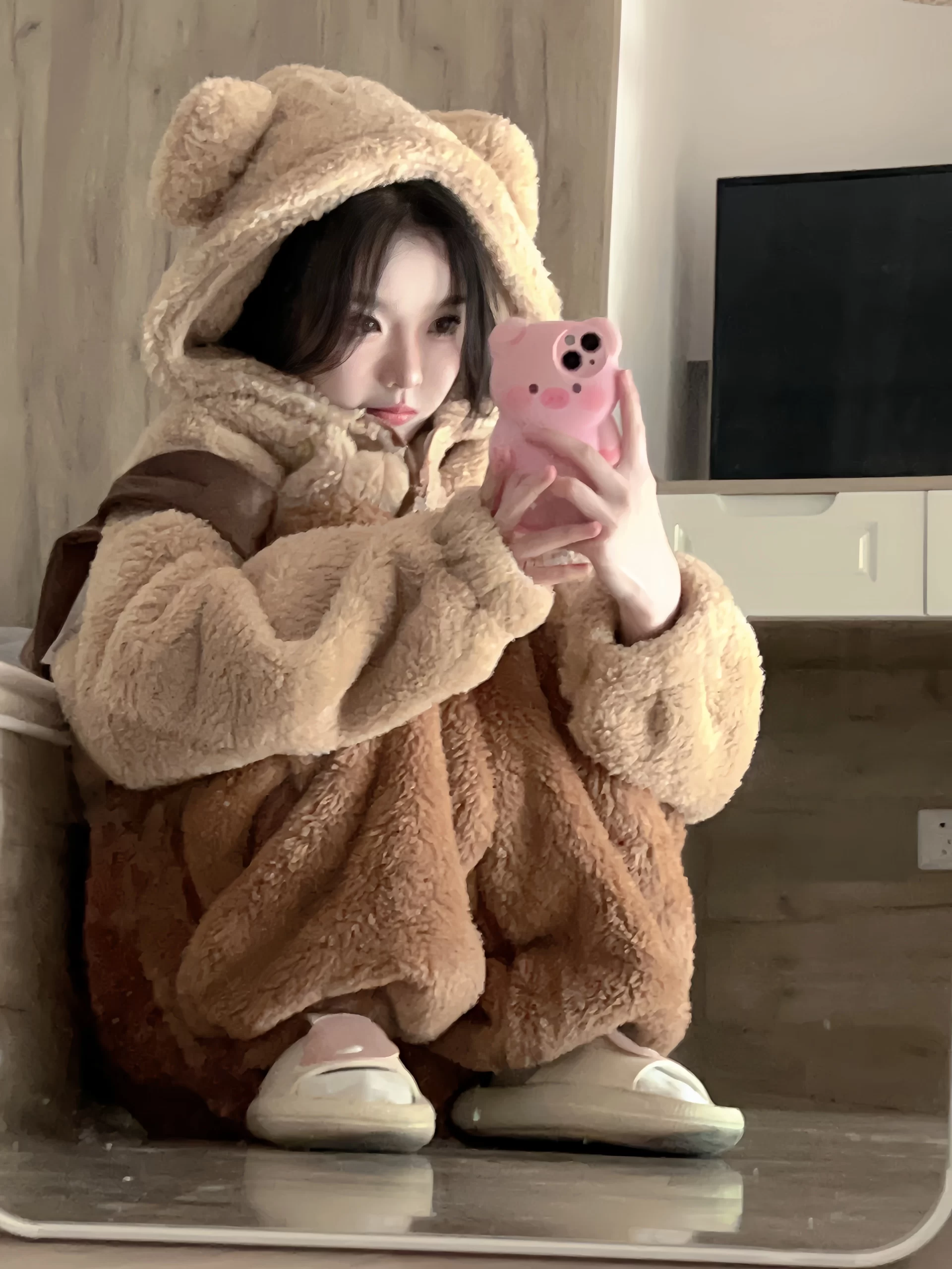 Conjusational coral velvet girl thickened cartoon bear pajamas