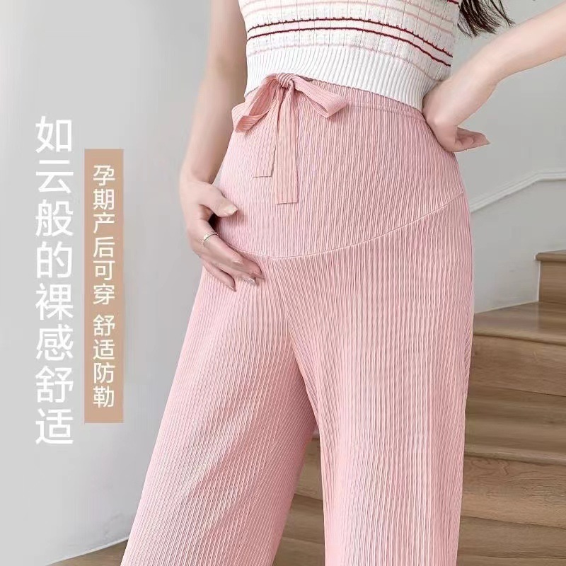 Maternity Summer Belly-supporting Ice Silk Breathable Wide-leg Pants plus size Loose Outer Wear Daily Casual Straight Adjustable Pants