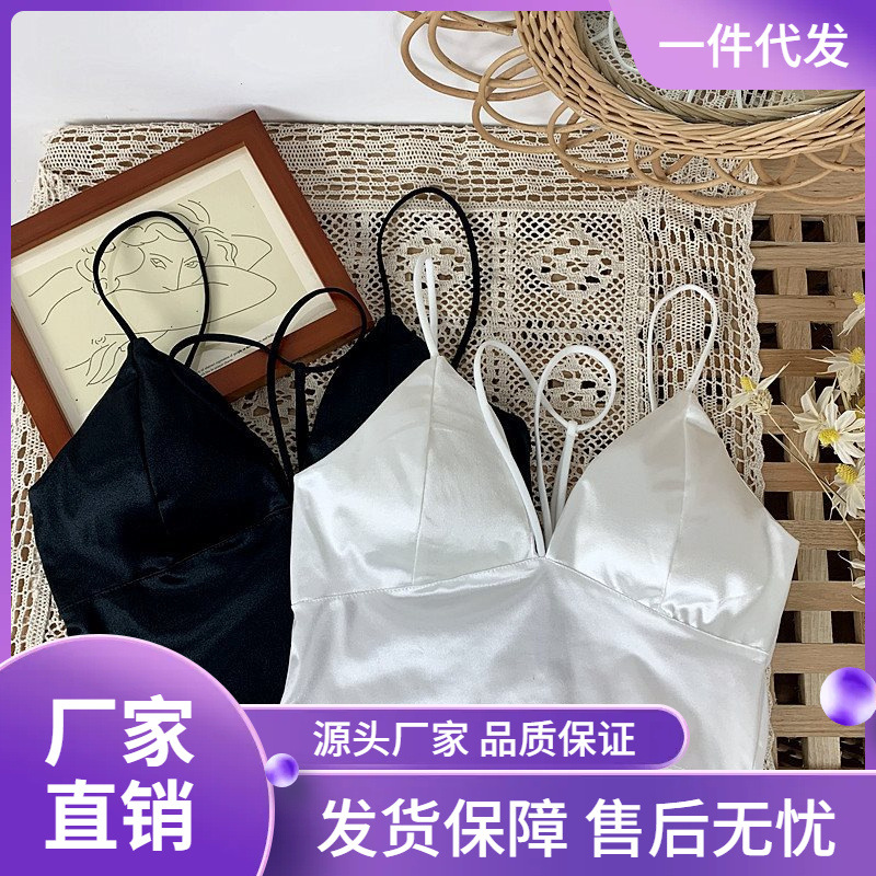 Internet Celebrity Caution Machine Hanging Neck Silk and Satin Wrapped Chest Underwear Women’s V-neck Base Outer Wear Sling Small Vest with Chest Pad Tube Top
