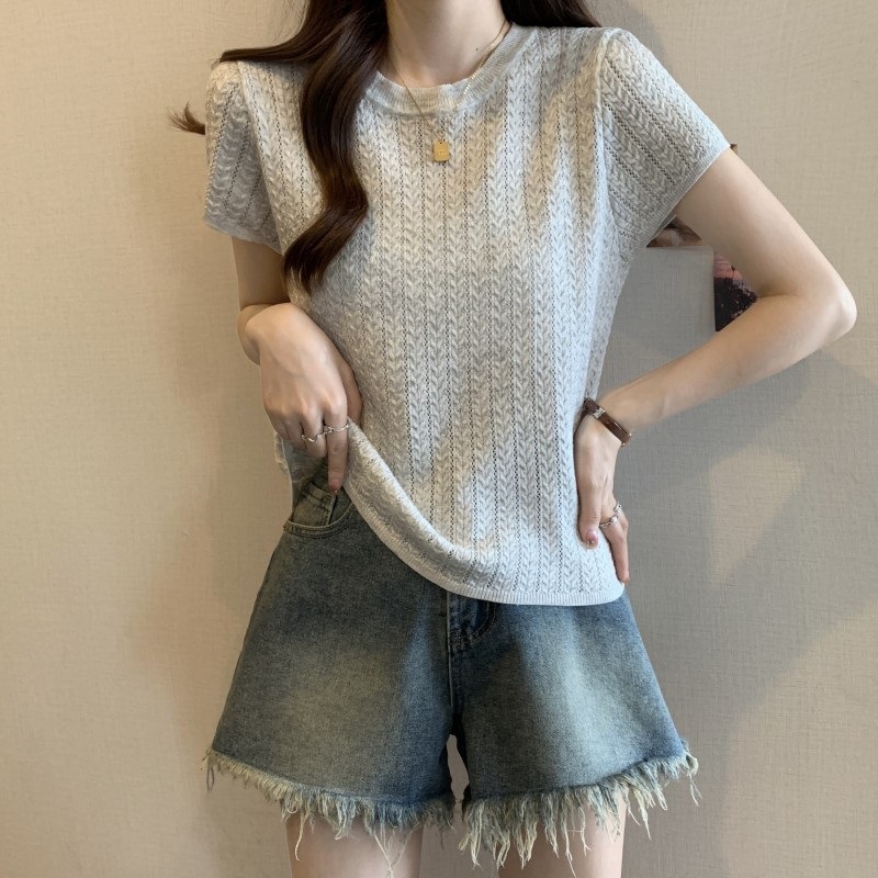 Oat Grey Twist Knitwear Shoulder Short-sleeved T-shirt Women’s Summer Large Size Unique Small Shirt for Chubby Girls Age-reducing Top