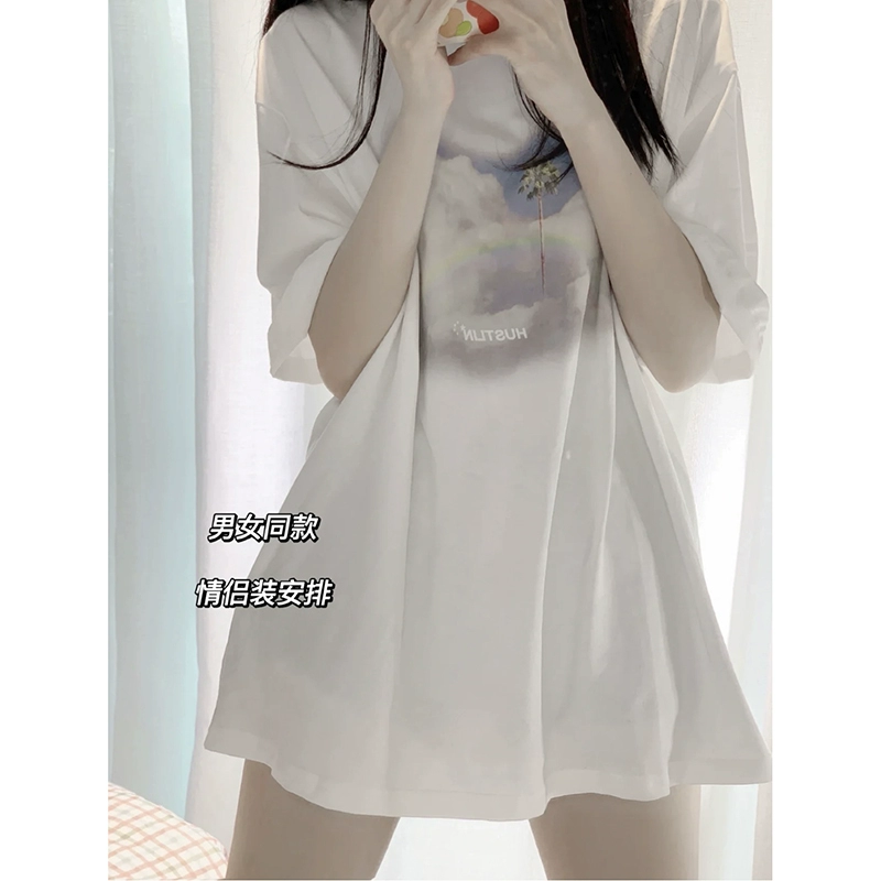 White mid -length cotton short -sleeved T -shirt female loose summer Korean version oversize head shoulder design feel shirt