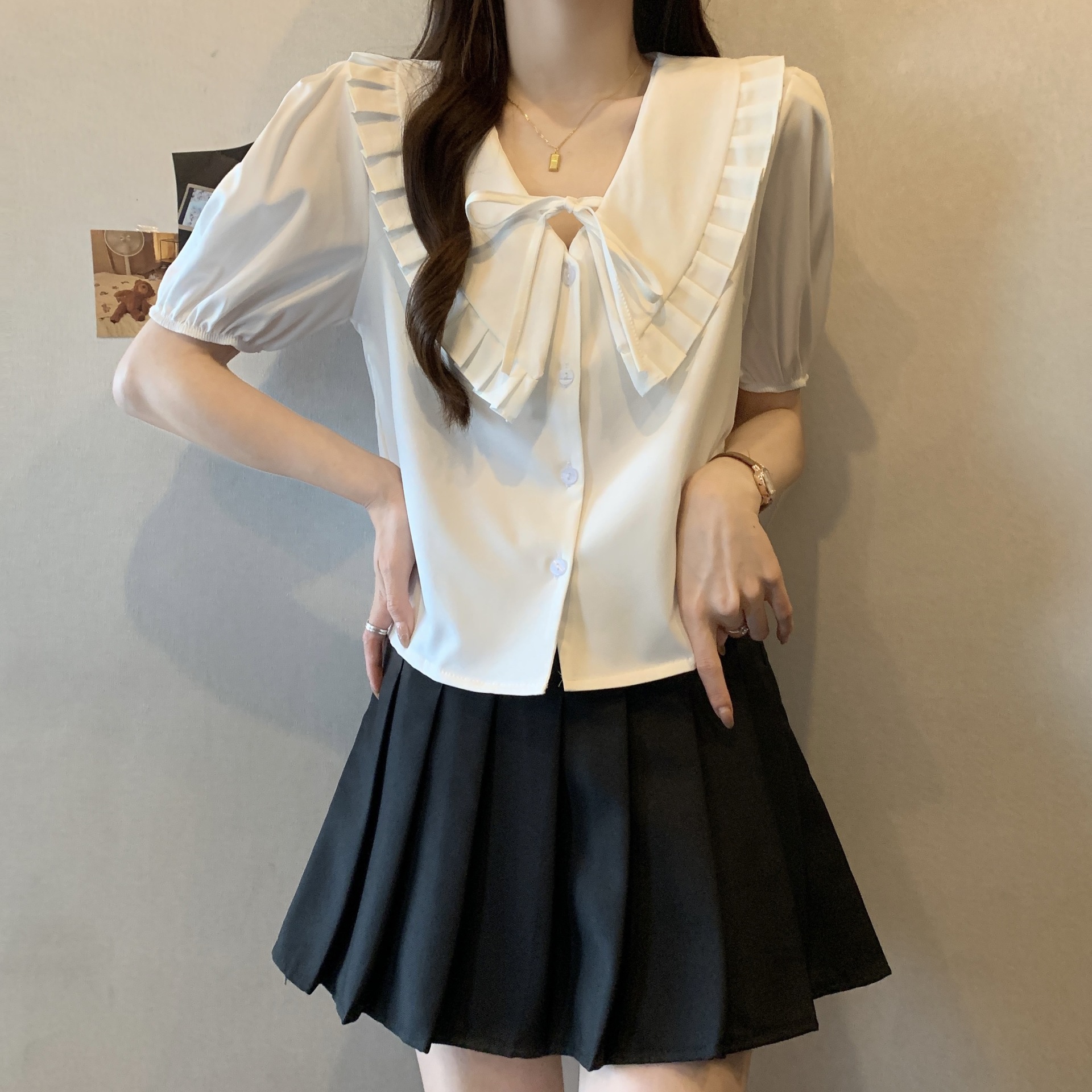 French Puff Sleeve Top Women’s Summer Doll Collar Short Sleeve Shirt Single-breasted French Pleated V-neck White Shirt