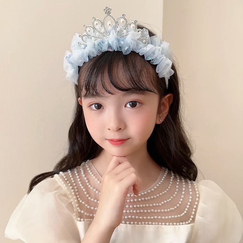 New Princess Elegant Crown Headwear Little Girl Mesh Bow Pearl Headband Pleated Lace Embroidered Headband