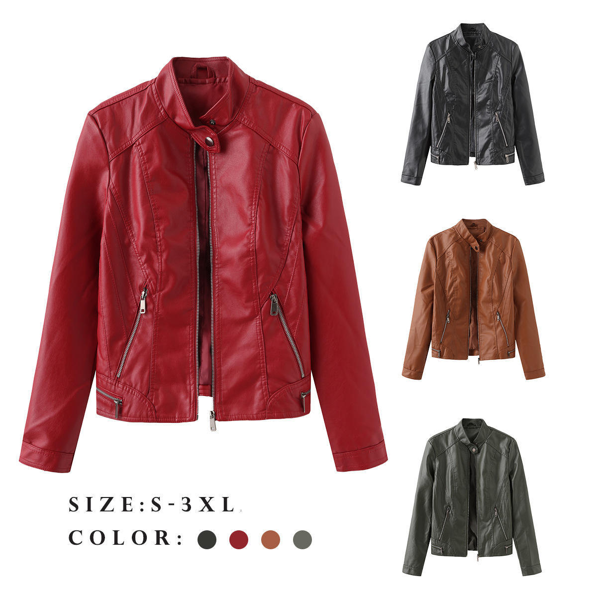 Zipper leather jacket stand collar 2023 women’s leather coat spring and autumn coat long sleeve casual