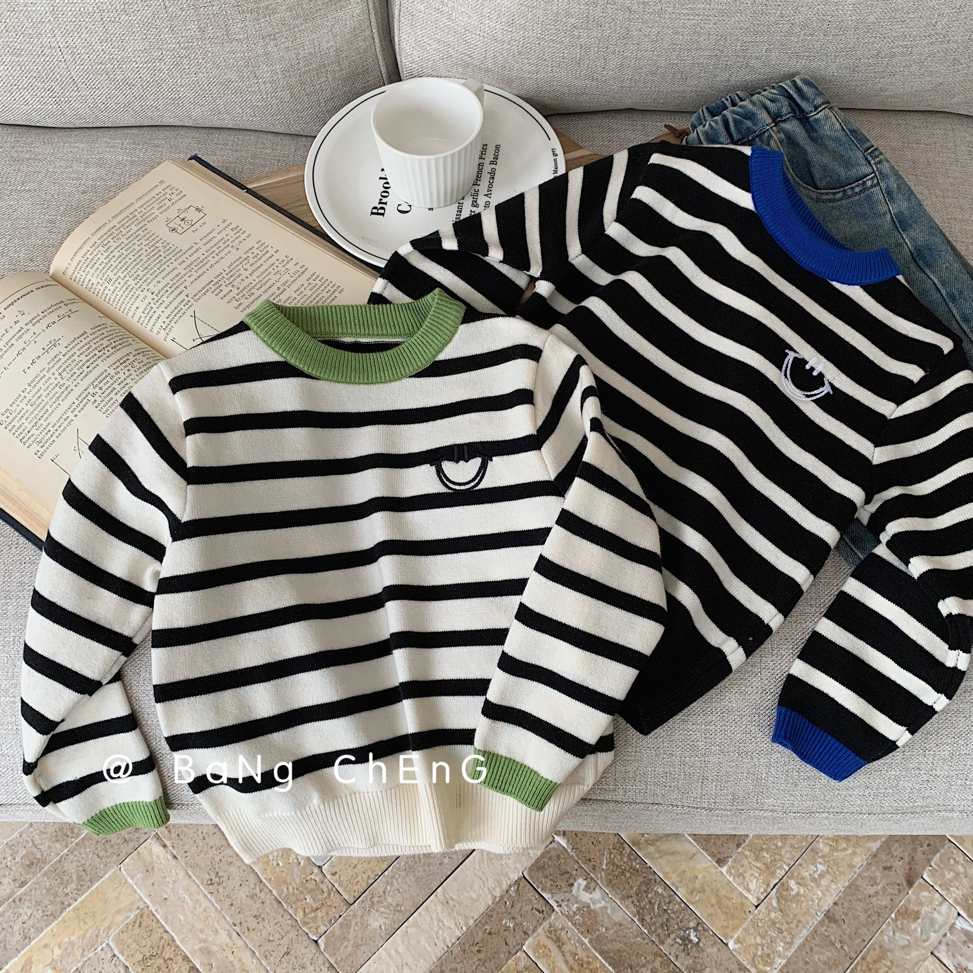 Children’s sweater Bangcheng 2024 spring new embroidered Smiley top children’s clothing boys’ striped bottoming trendy MY0021