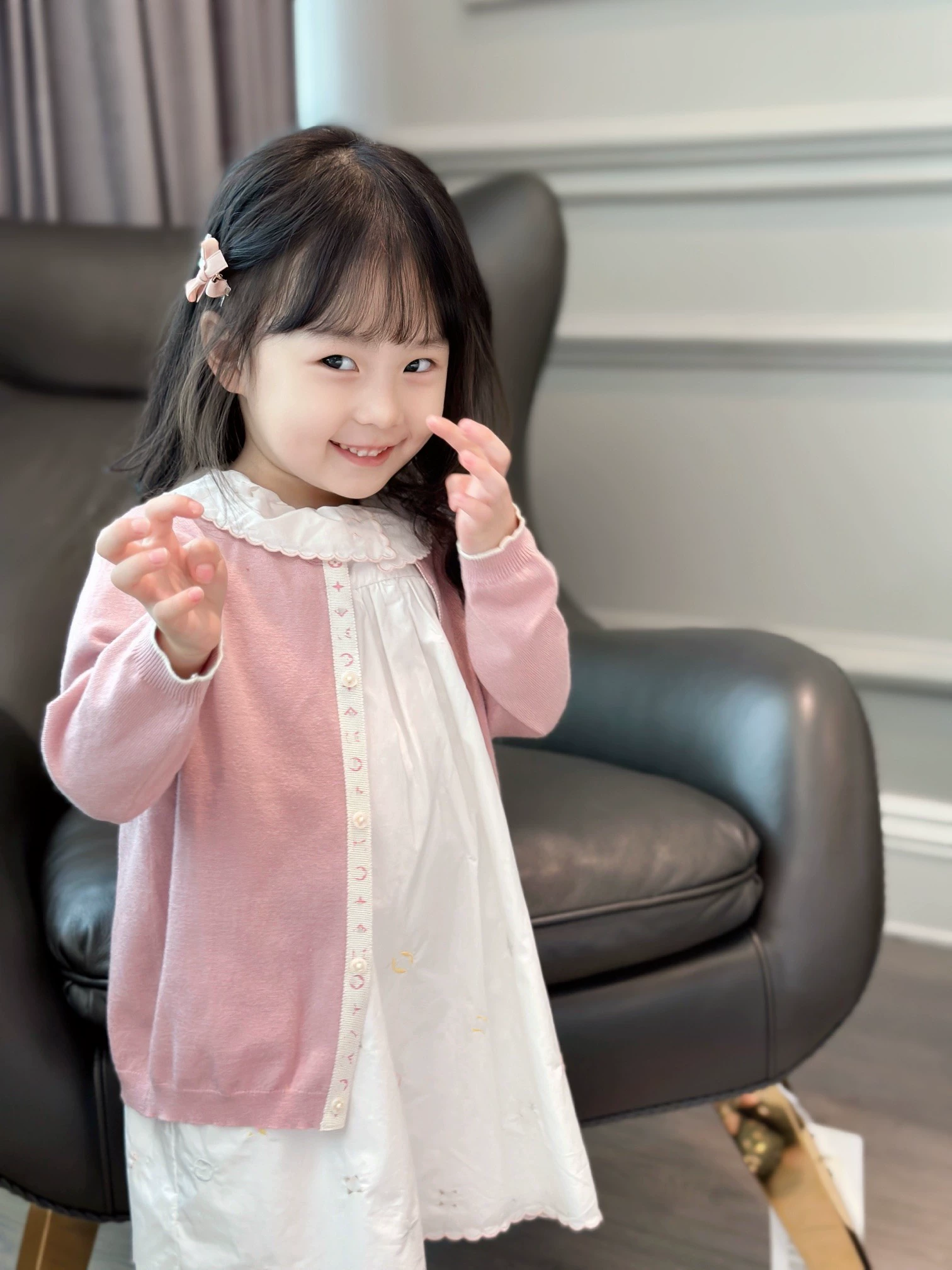 24 spring and summer new pink knitted cardigan for girls, soft and cute versatile top, classic embroidery print embellished children’s clothing