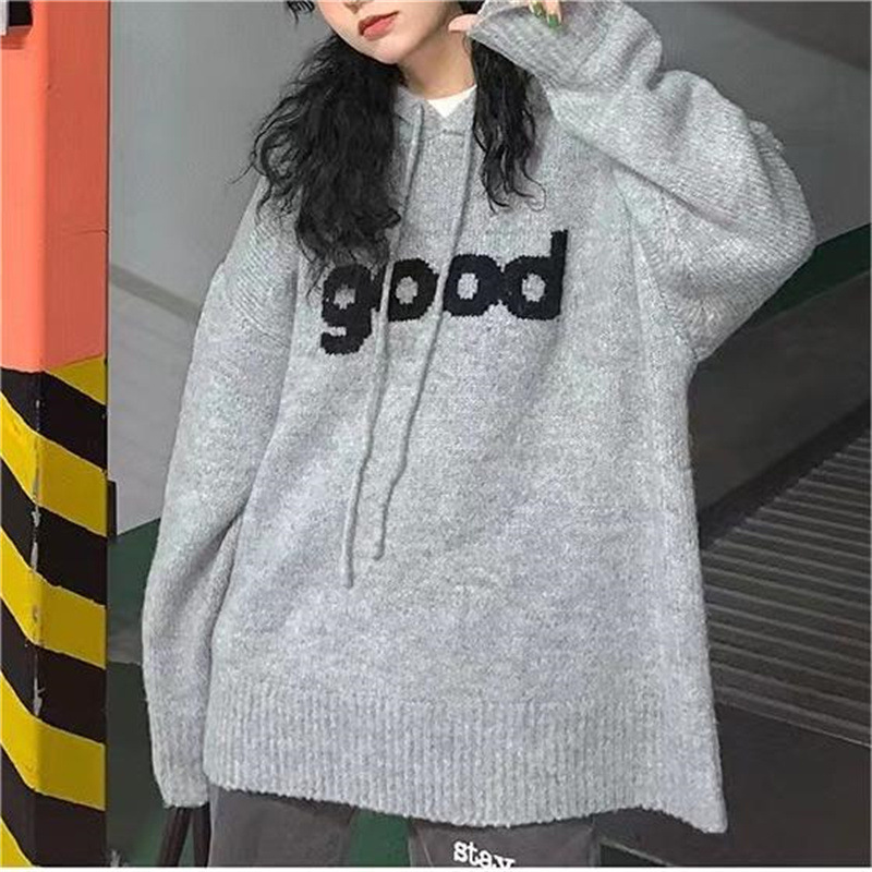 Lazy style hooded knitted coat for women autumn and winter New loose slimming classic gray women’s Jacquard knitted sweater