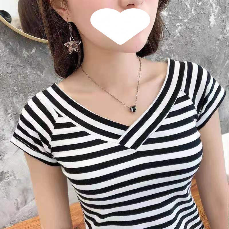 2024 Summer Western Style Korean Style Striped Short-sleeved Double V-neck T-shirt Women’s Striped Shirt All-match Slim-fit Sexy New Arrival