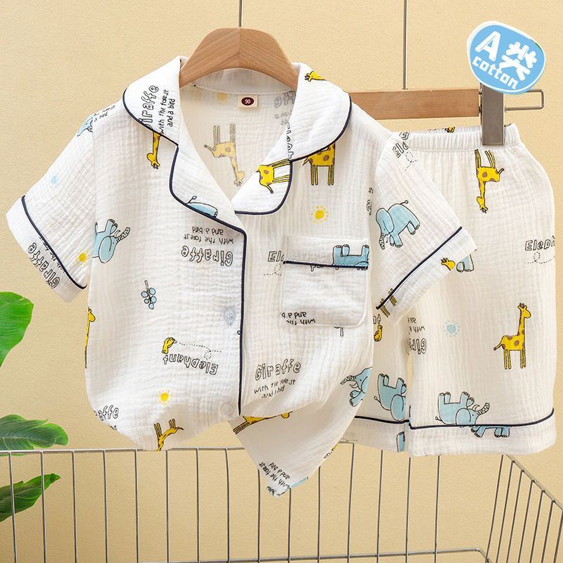 Children’s Double-layer Cotton Short-sleeved Shorts Air-conditioning Clothing Boys and Girls Summer Thin Pajamas Cardigan suit Home Clothes