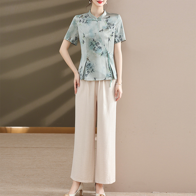 Mother’s Summer Dress Elegant National Style Short-sleeved suit New Chinese Style Vertical Collar Printed Age-reducing Slimming Middle-aged and Elderly Two-piece Set for Women