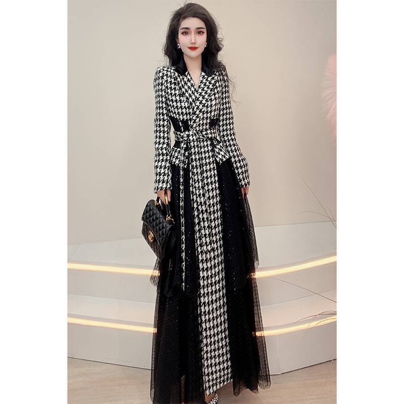 Plaid Hepburn style long trench coat French houndstooth Chanel style coat for women 2023 autumn and winter New
