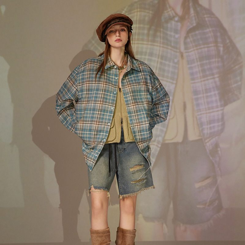 Ru Meng American Retro Blue Plaid Shirt Women’s 2024 Spring New Casual Coat Ruai Handsome Long Sleeve Shirt