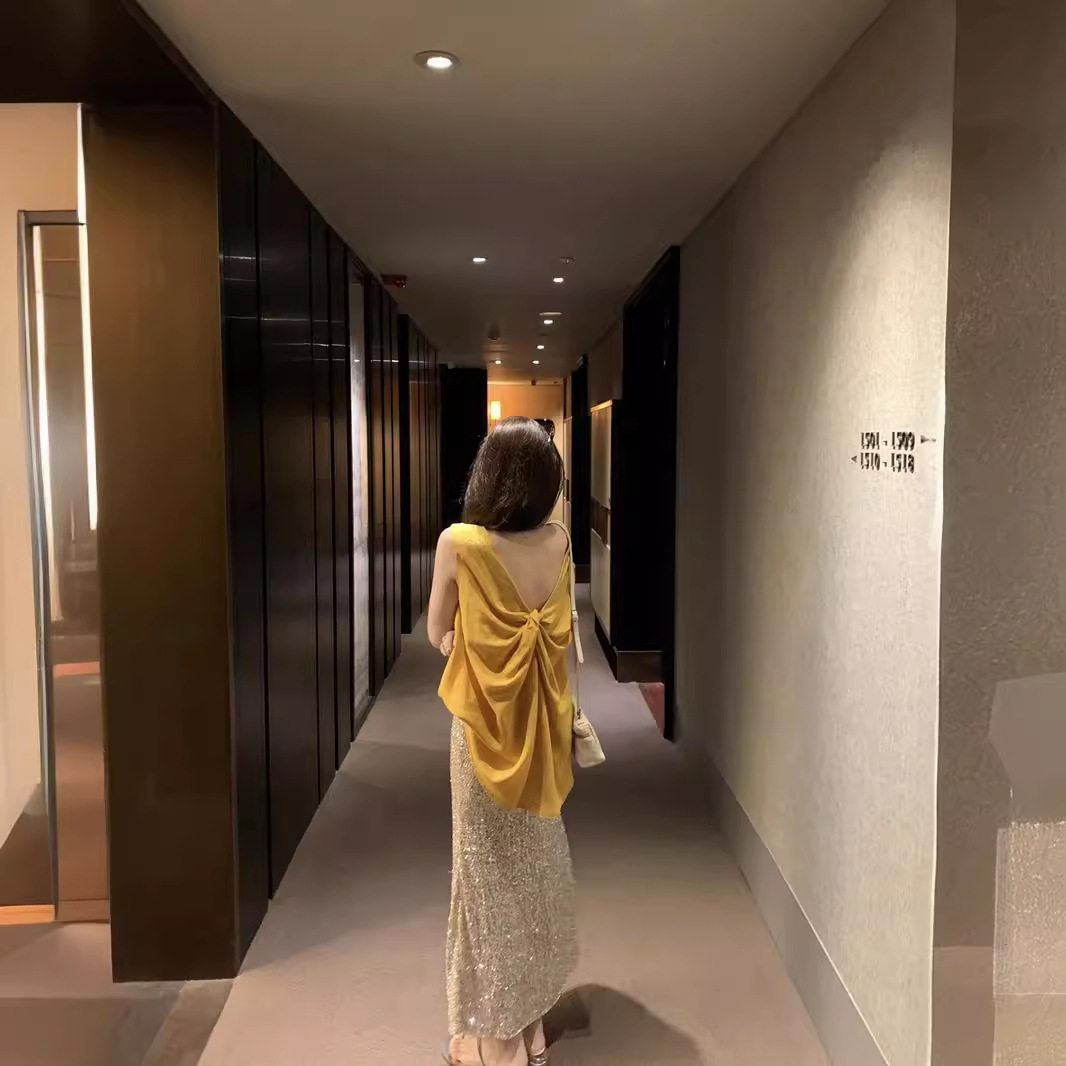 Summer Round Neck Sleeveless Shirt Retro Chic Small Shirt Women’s Design Sense Backless Kink Vest Sequin Long Dress suit