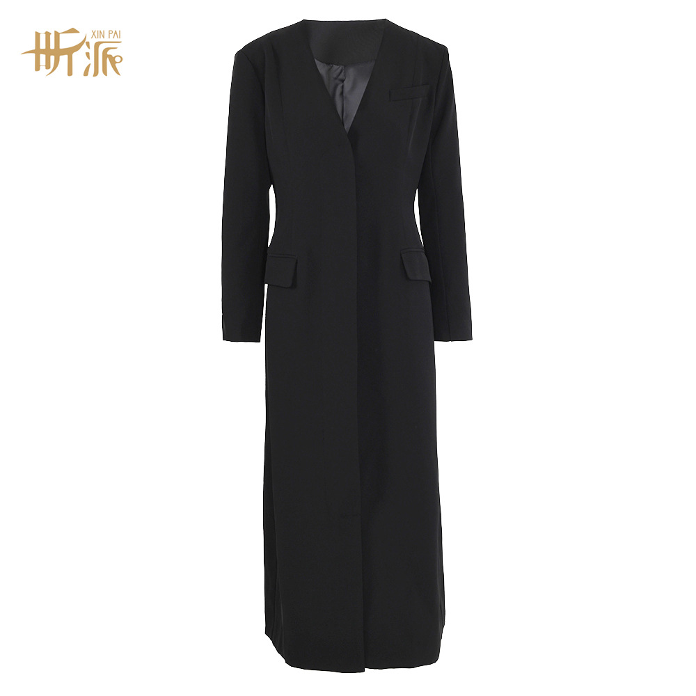Autumn and winter New elegant high-grade black long elegant trench coat V-neck cross-border waist slimming commuter coat for women