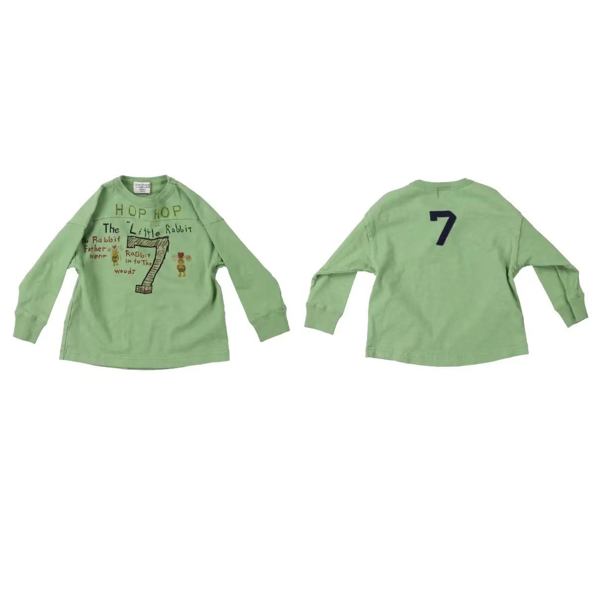In stock 2024 spring DD Japanese children’s number 7 letters flocking printed cartoon graffiti slub cotton long sleeve T-shirt