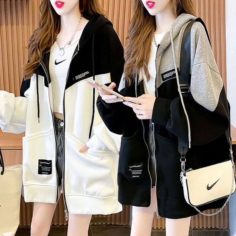 Chubby Large Size Color-blocked Hooded Cardigan Sweater Women’s Spring and Autumn New Korean Style Loose Mid-length Top Coat