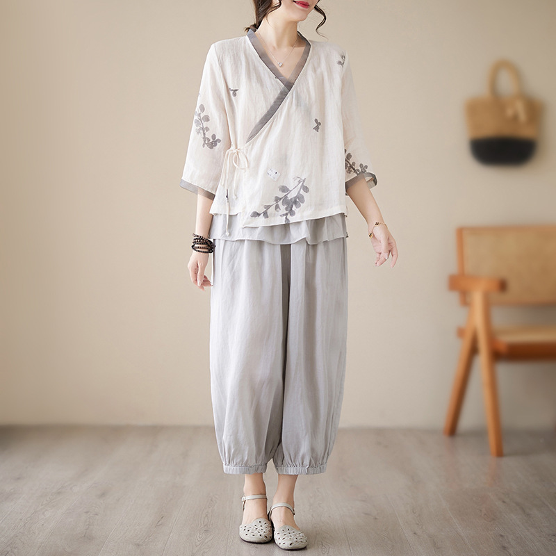2024 Spring and Summer New Ramie Ink Printing Loose Casual Ethnic Style Suit Cropped Pants Wide Leg Pants for Women
