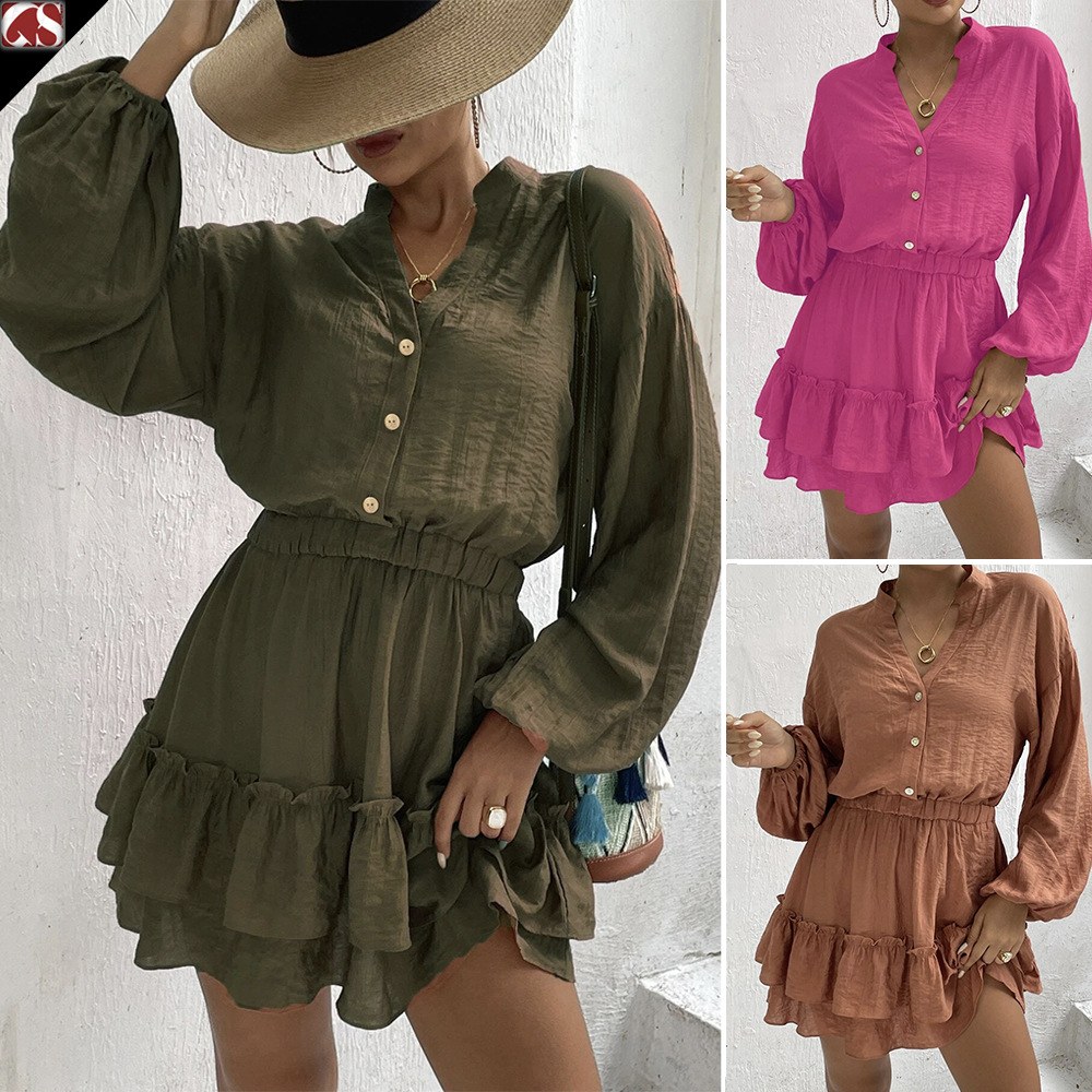 2023 Amazon Dress European and American Autumn Long-sleeved Rayon Waist Ruffled Casual Elegant A- line Short Dress for Women