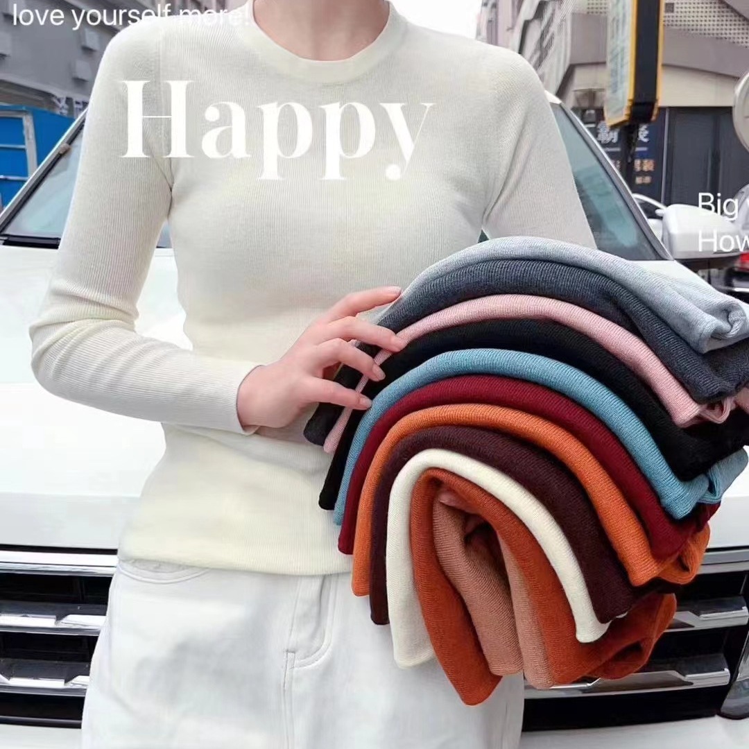 Spring wool round neck base shirt Women’s U collar pullover elegant slimming solid color sweater knitted thin white