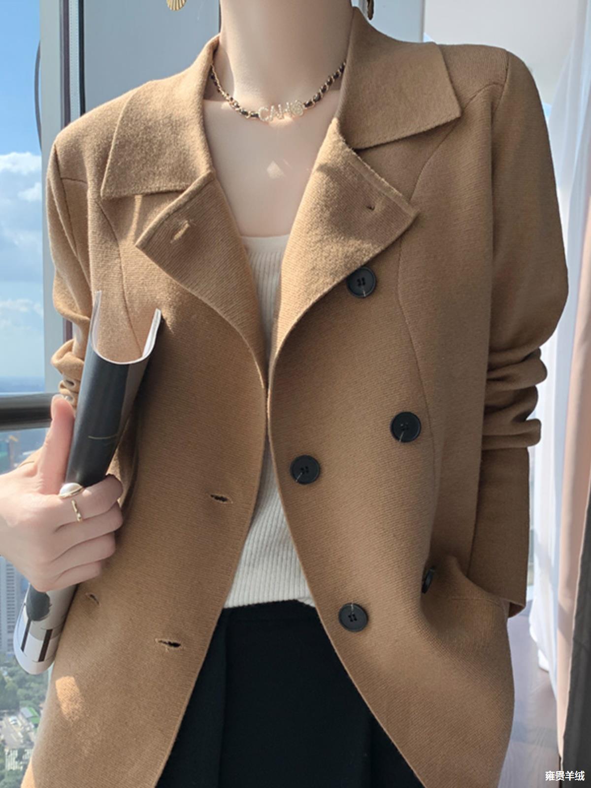 Early spring new worsted wool knitted cardigan solid color double breasted suit collar jacket loose lazy long sleeve top