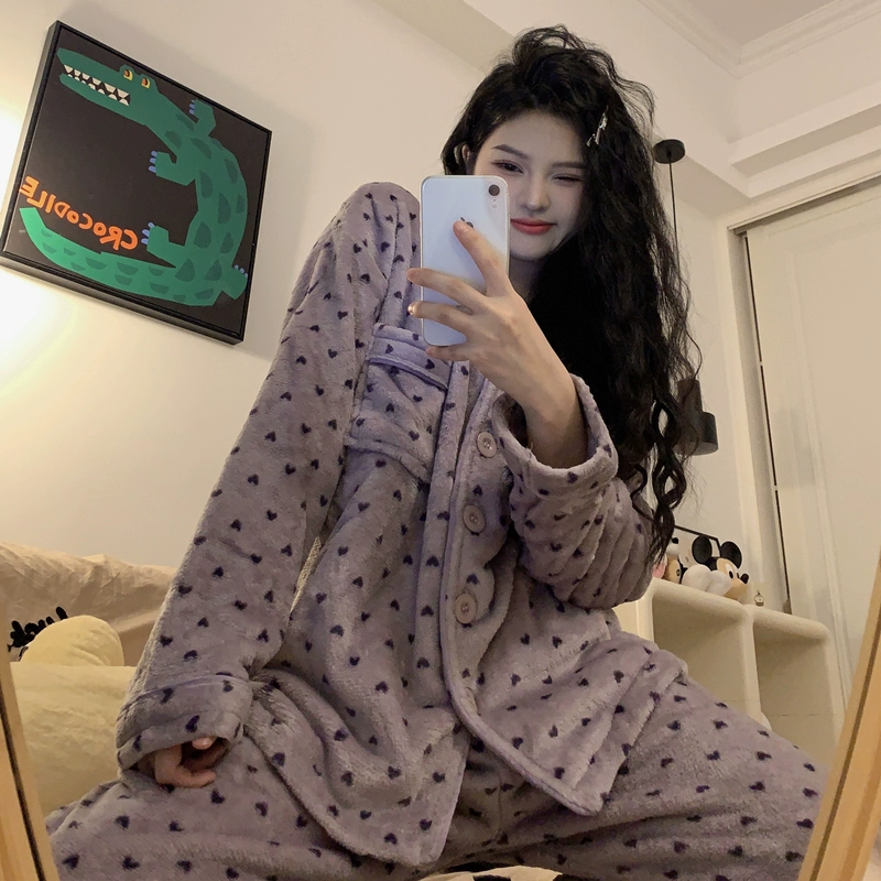 Korean ins purple coral velvet pajamas for women autumn and winter plus velvet thickened lapels long-sleeved trousers home wear set