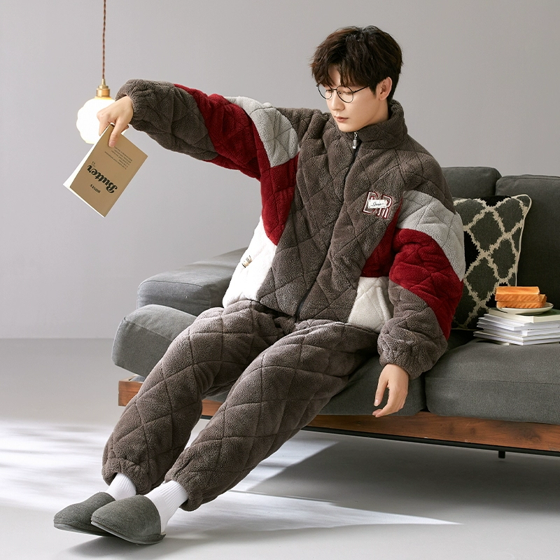 Coral velvet three-layer quilted pajamas for men winter plus velvet thickening simple warm zipper men’s home wear set