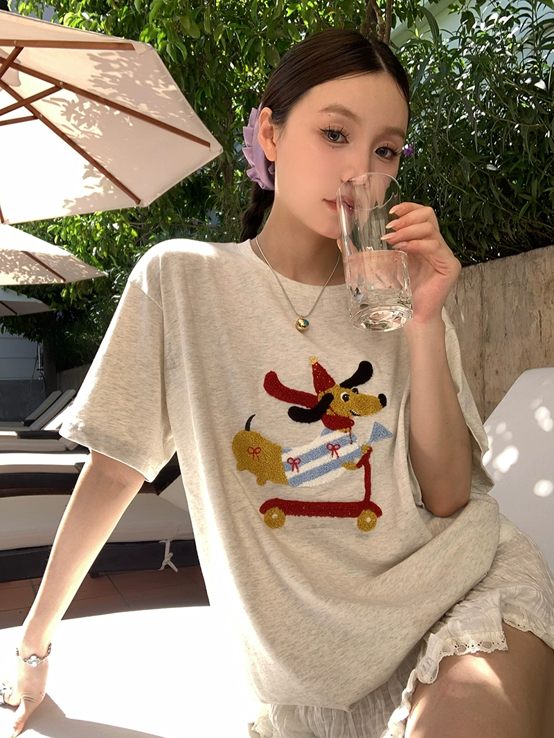 Age-reducing short-sleeved loose casual design with puppy embroidery