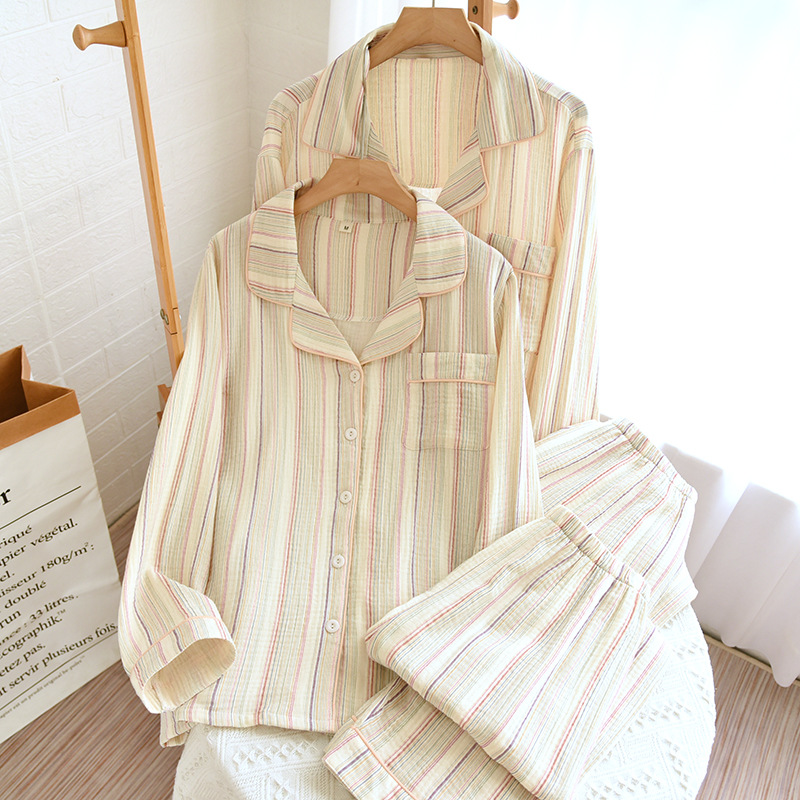 Autumn 2023 New Style Striped Crepe Double Gauze Couple’s Pajamas Men’s and Women’s Long Sleeve Lapel Set