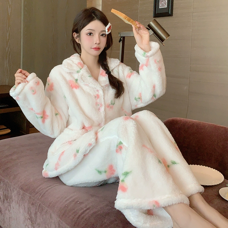 Pajamas for women in autumn and winter coral velvet warm plus velvet thickened cardigan that can be worn outside sweet floral flannel home clothes