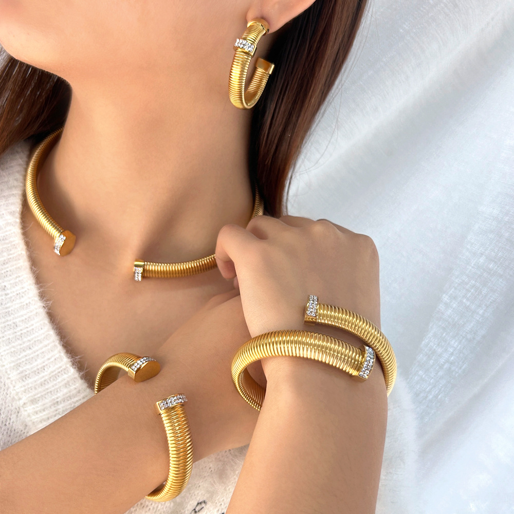 Cross-border hot sale 18K earrings open bracelet collar jewelry suit inlaid zircon Internet celebrity fashion jewelry wholesale