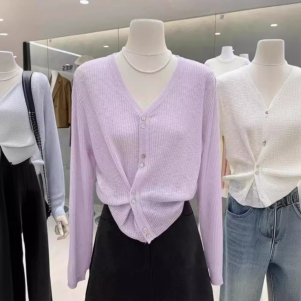 Knocking to show bone feeling high quality cool feeling Tencel linen V-neck knitted cardigan women’s solid color thin air conditioning sunscreen shirt