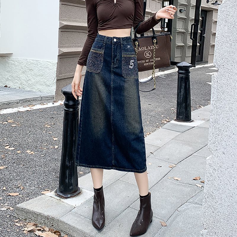 Vintage 2024 Denim Skirt with Diamond Women’s Small New High Waist Mid-length Hot Drilling Split Step Skirt