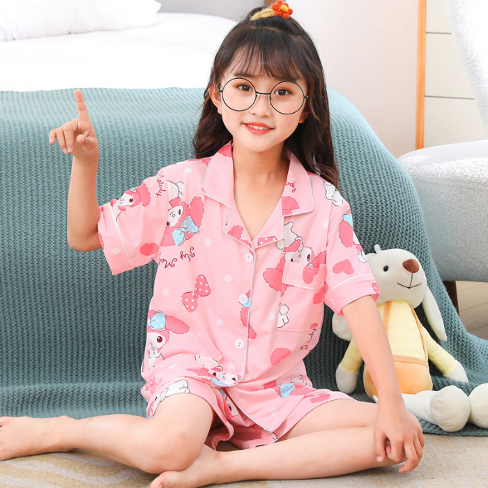 Summer Children’s Pajamas Women’s Thin Imitation Cotton Lapel Short-sleeved Cartoon Sweet Loose Home Clothes for Kids