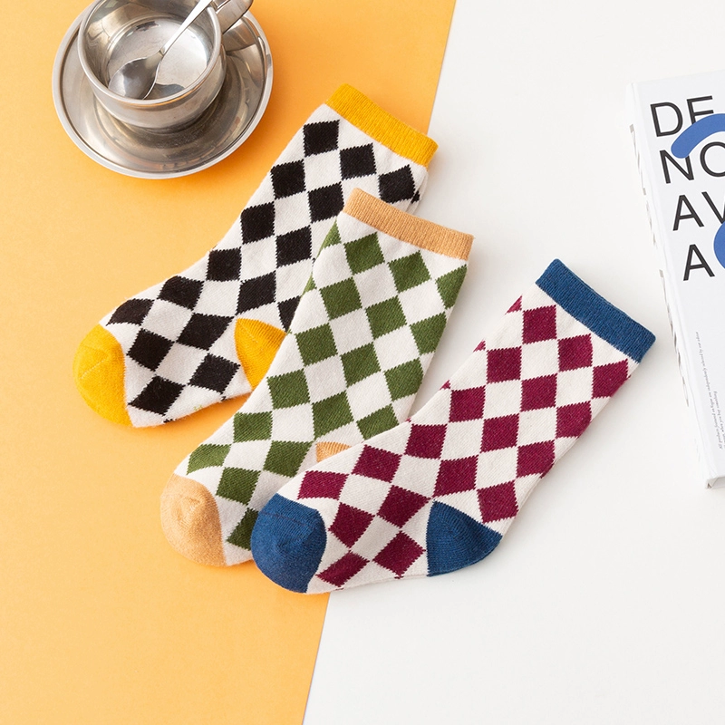 Trendy socks for autumn and winter forest style plaid contrasting colors for big children mid-calf socks