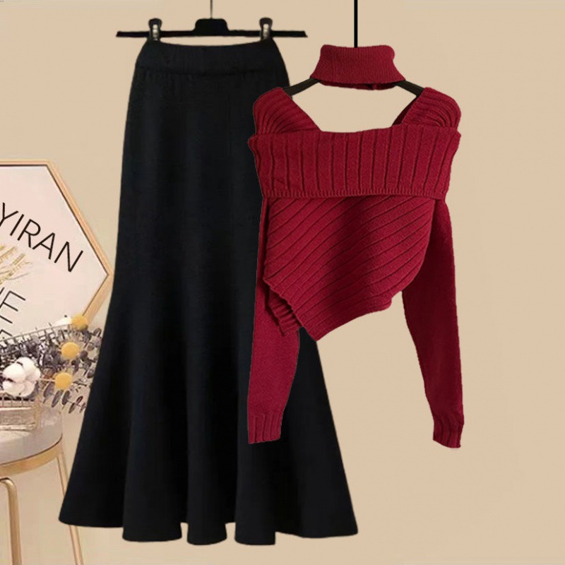 New Year’s Robe suit 2024 Winter New Sexy Spice Shoulder Red Sweater Fishtail Dress Two-Piece Trendy