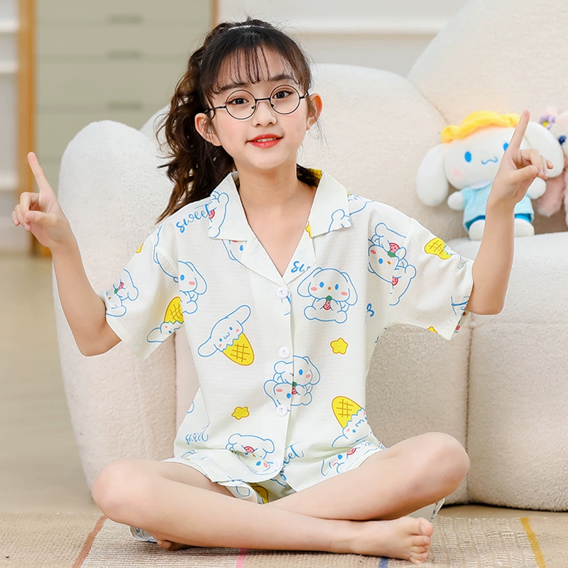 Children’s pajamas Little Beaver Ruby puff cotton short-sleeved summer lapel cardigan cartoon girl thin baby suit