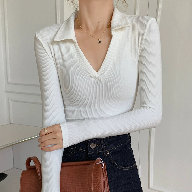 European and American V-neck elastic slim retro long-sleeved polo shirt