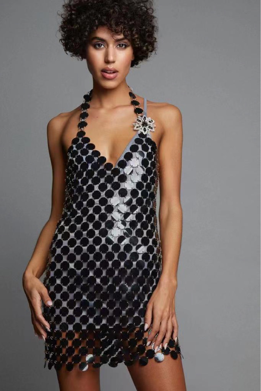2022 European and American Ebay hot sexy fishing net rhinestone sling neck hollow vest skirt transparent glass material