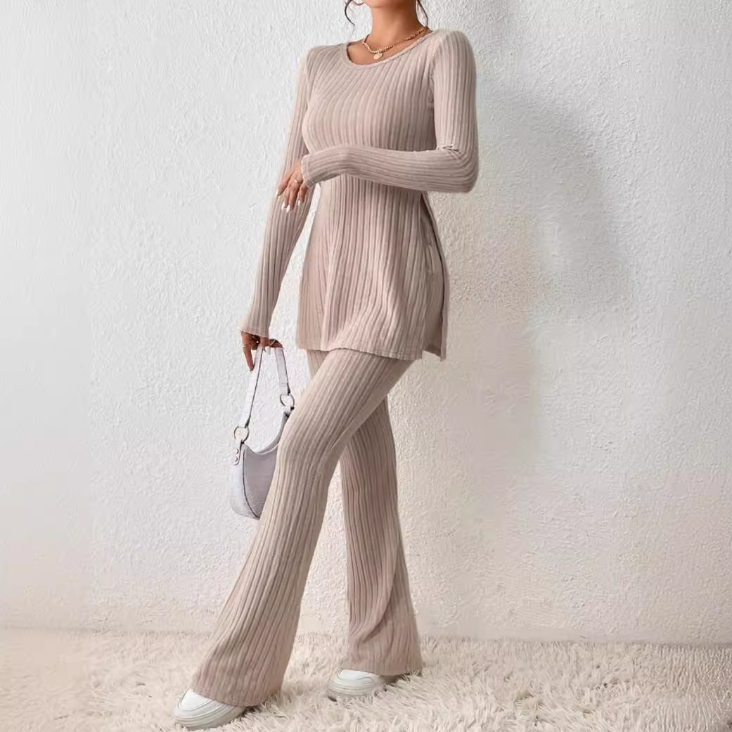 2023 European and American cross-border women’s clothing solid color sexy casual long sleeve round neck split fashion temperament two-piece set suit