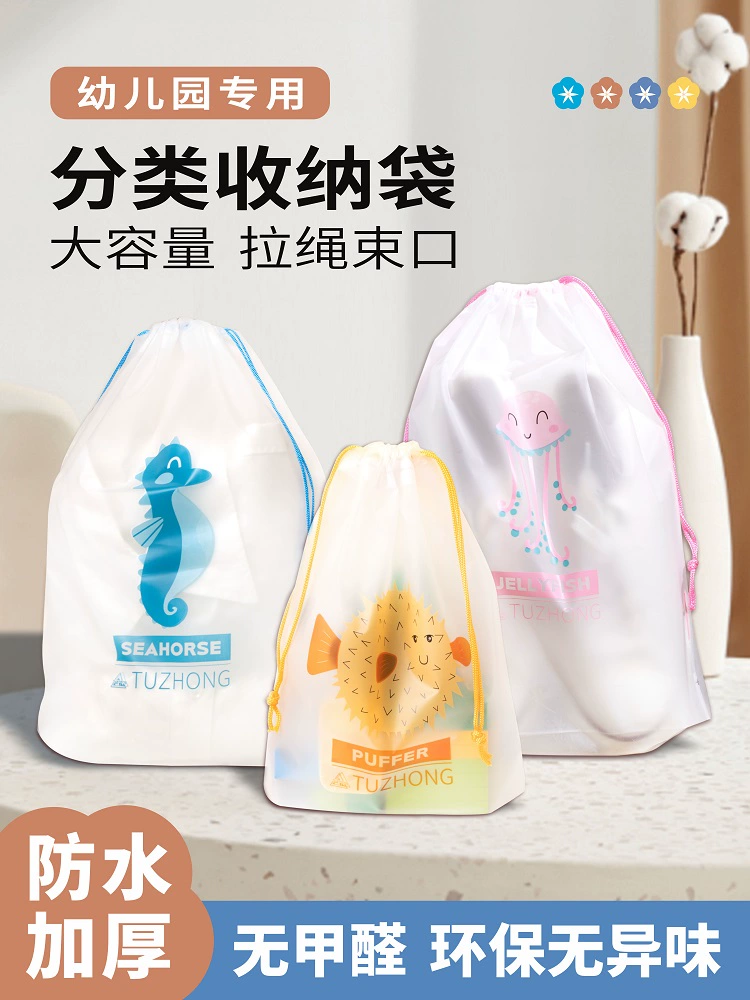 Kindergarten storage bag, sealed bag, drawstring, waterproof clothing organizer, pocket, underwear, shoes, portable