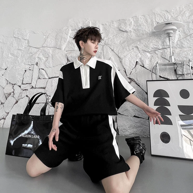 Black and white contrasting semi -zipper POLO shirt, handsome summer dress