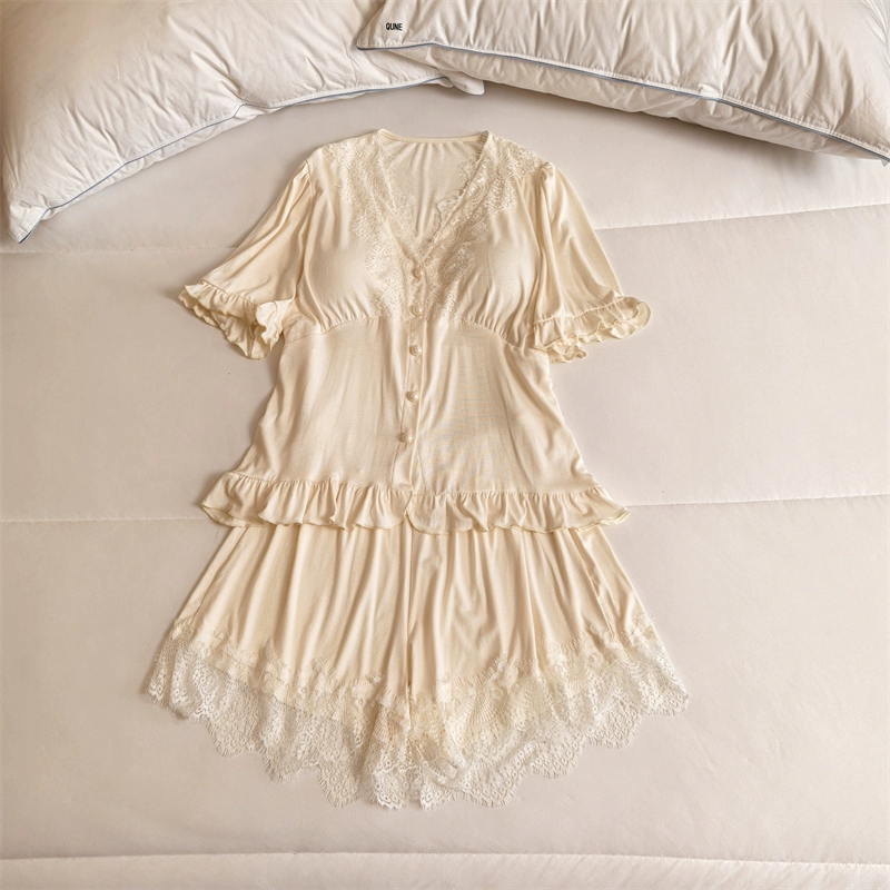 Modal with chest pad pajamas Female spring and summer short -sleeved cardigan two -piece new lace lace sexy home service