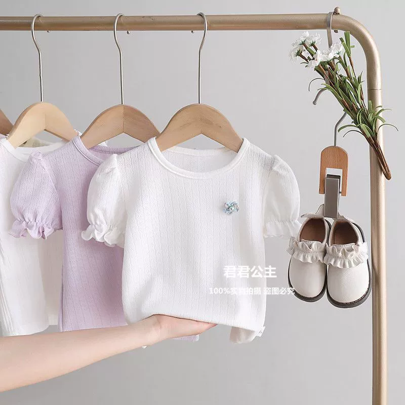 2024 new summer children’s wear short-sleeved T-shirt baby round neck top female baby puff sleeve fungus edge fashion