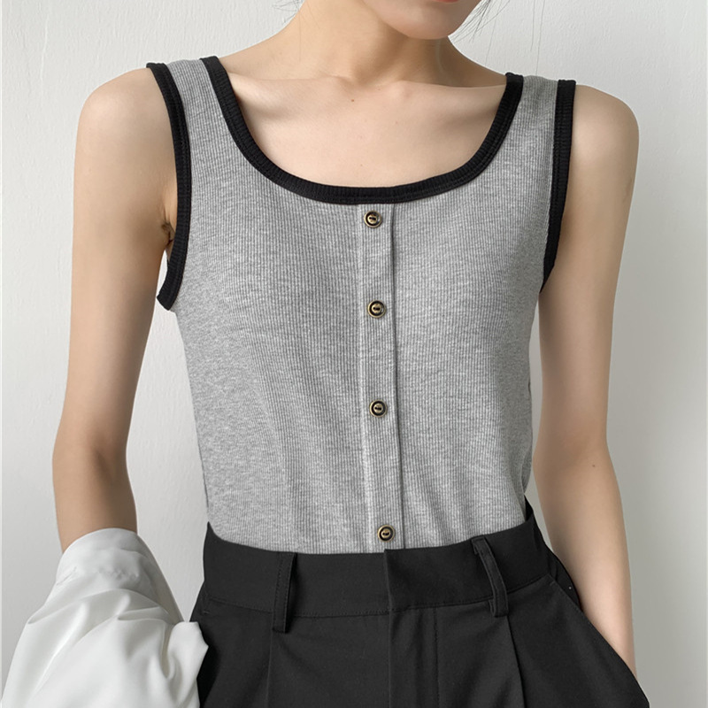 Women’s Spring and Summer New Korean Style Cotton Button Vest with Small Chanel Style Round Neck All-match Color Contrast Wide Shoulder Sling for Women