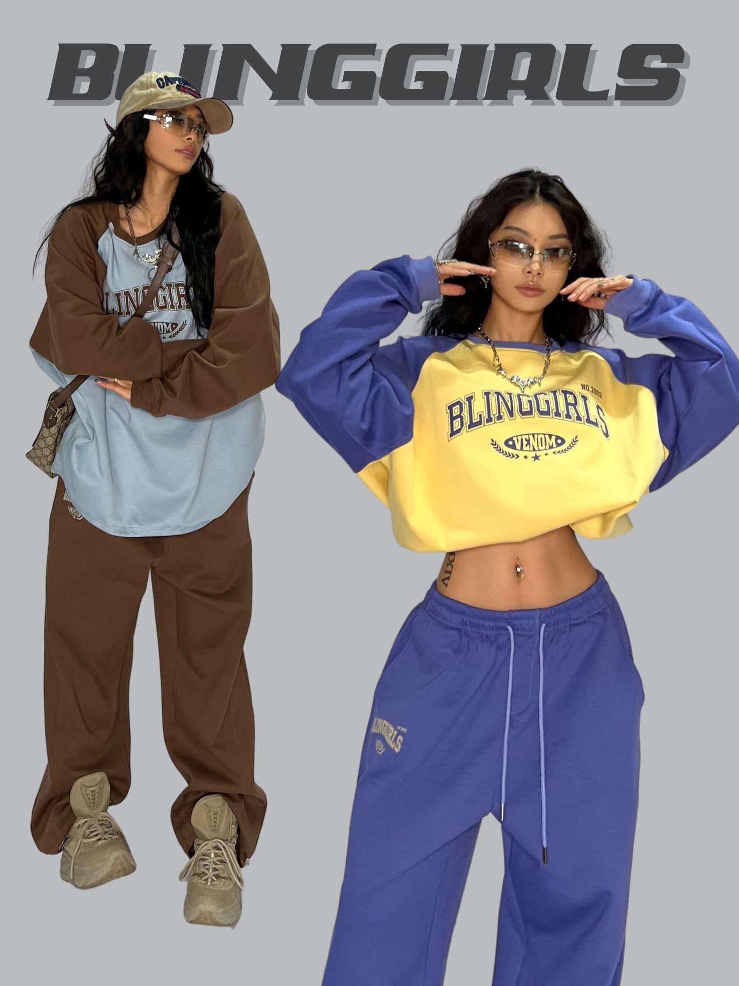 BLINGGIRLS Versatile Neutral Loose Splice Sleeve BF Style Crewneck American Style Retro Long Sleeve Trousers suit