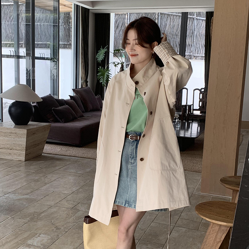 from anna stand collar loose casual workwear coat Women’s Mid-length Korean style 2024 early spring all-match windbreaker fashion