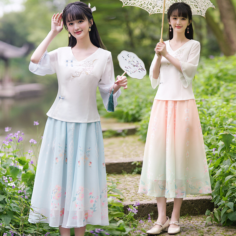 New Chinese Style National Style Embroidered V-Neck Improved Han Element Cropped Sleeve Top Chiffon Printed Large Swing Dress Set Lady