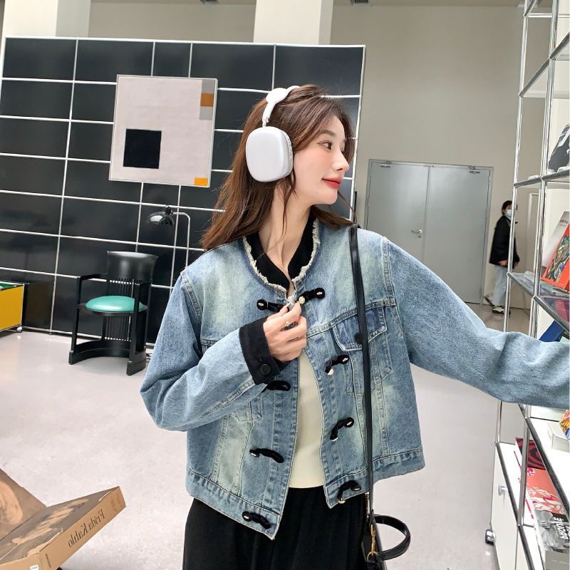 Real shot stand collar loose patchwork design sweet cool new Chinese style buckle short slimming retro all-matching Denim coat for women