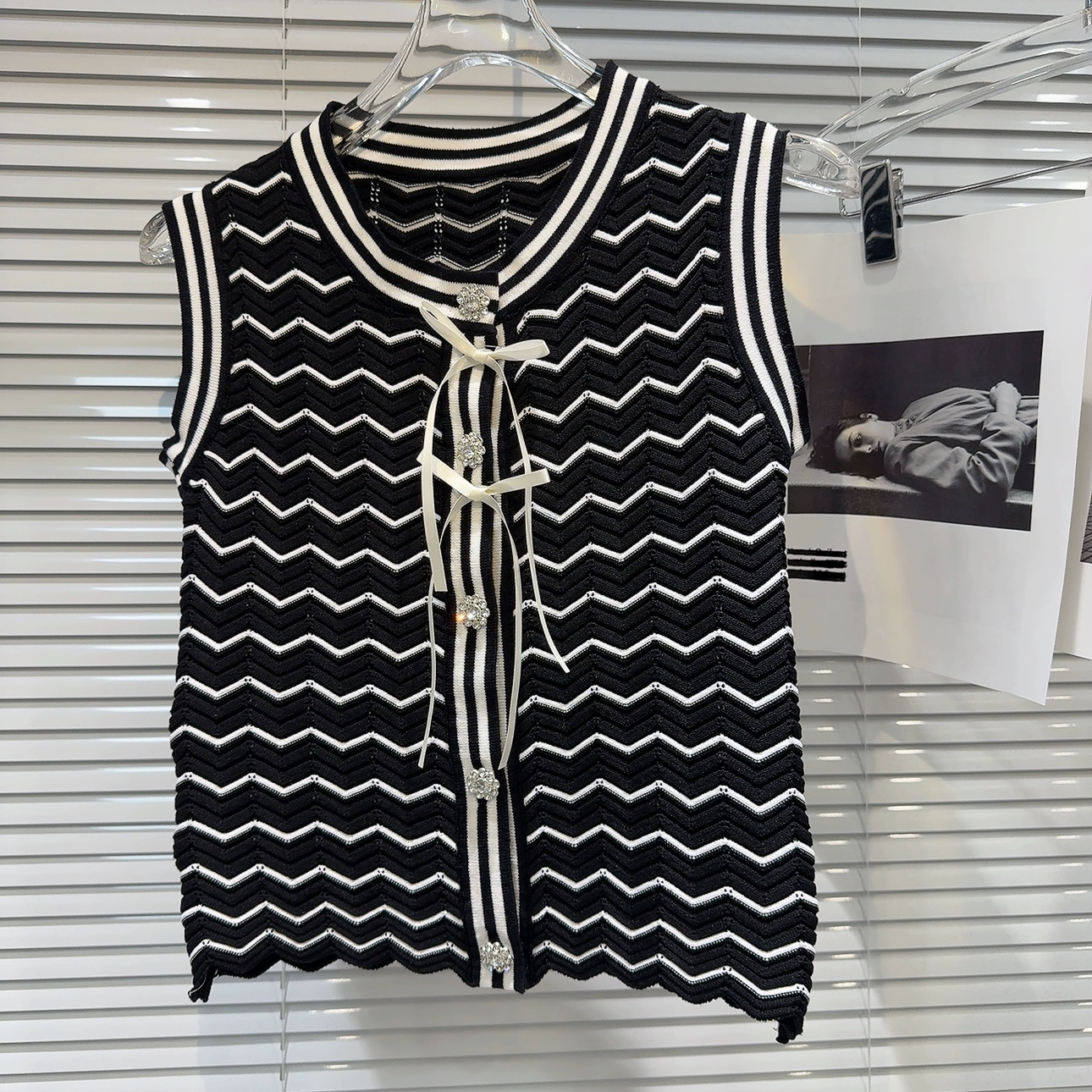 Internet celebrity Xiaoxiang rhinestone buckle wavy vest bow
